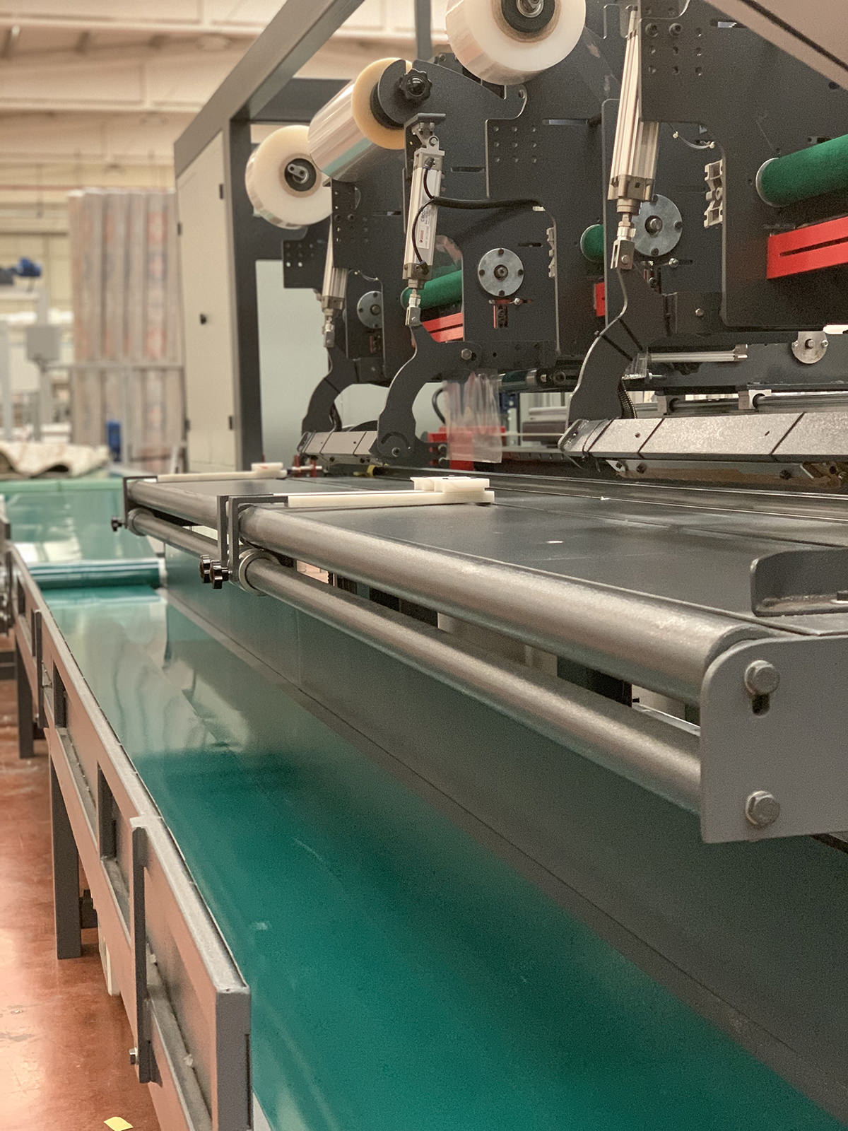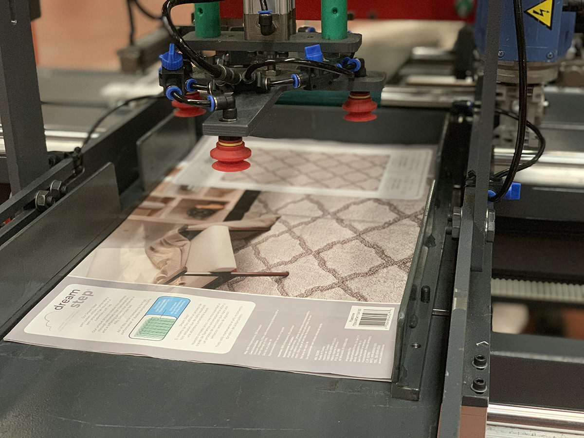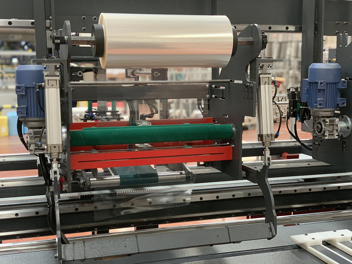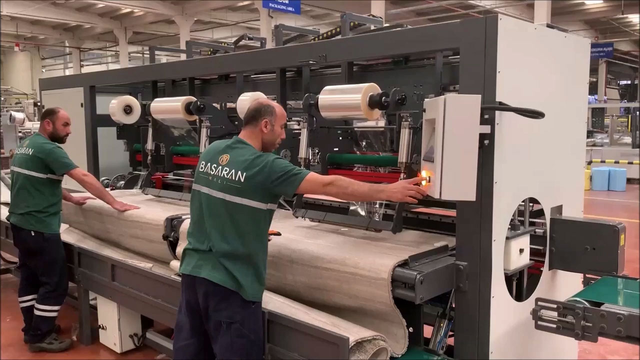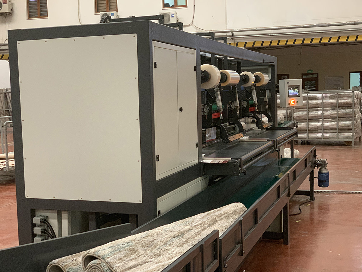 Tam otomatik parça halı sarım makinesi, halı imalat sektöründe üretilen halıların son aşamada pvc veya başka bir ambalaj malzemesi kullanılarak otomatik etiket ekleme ünitesi sayesinde etiket ilave edilip sarılarak satışa hazır hale gelmesini sağlar.