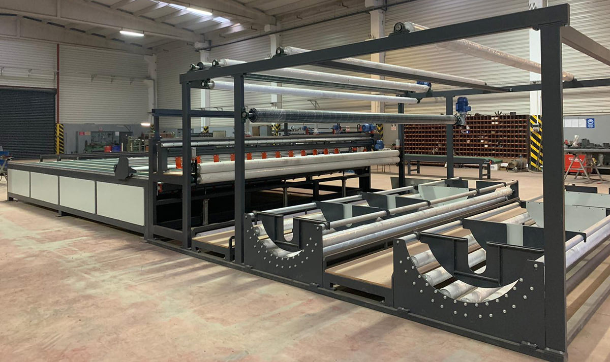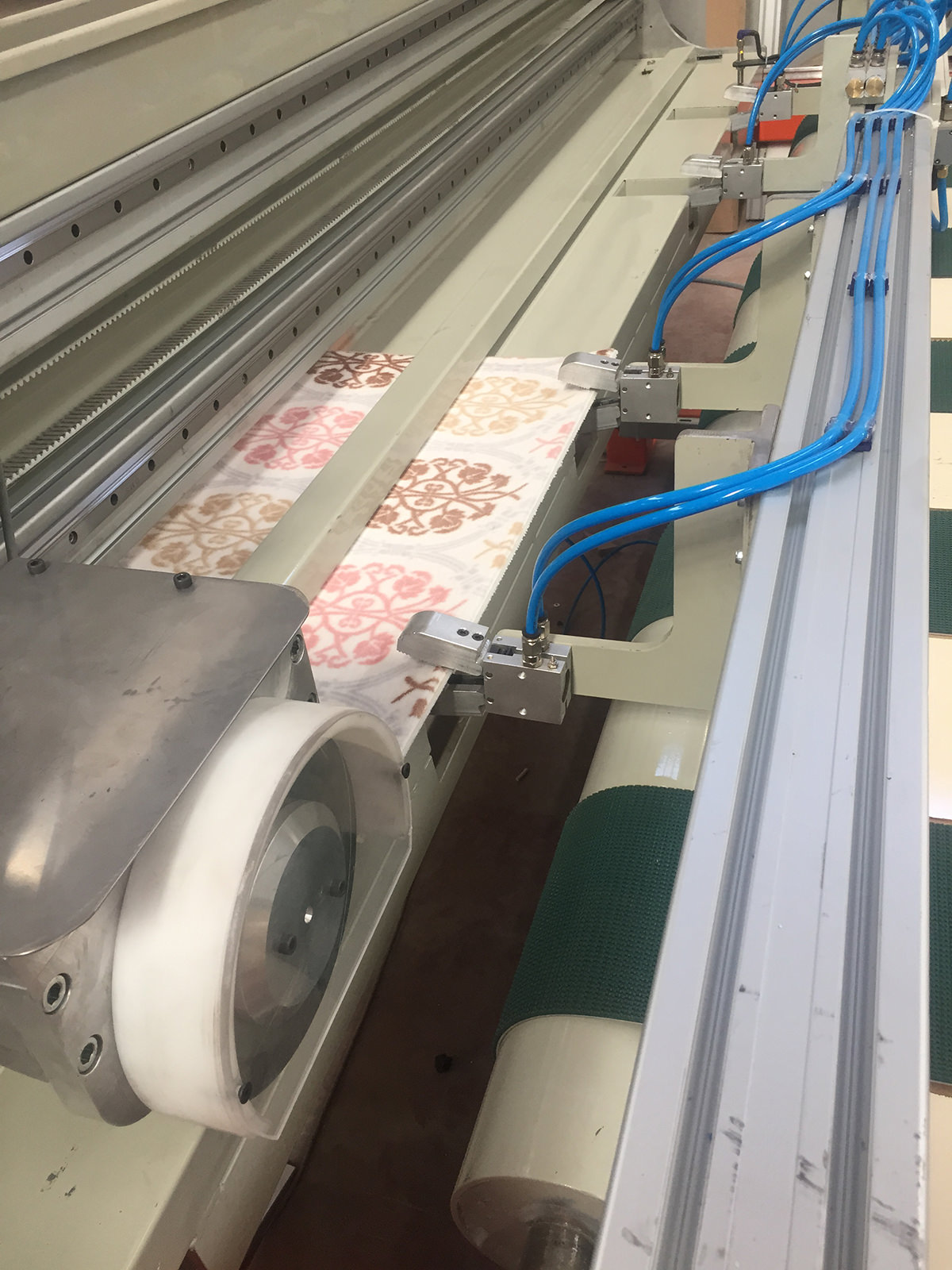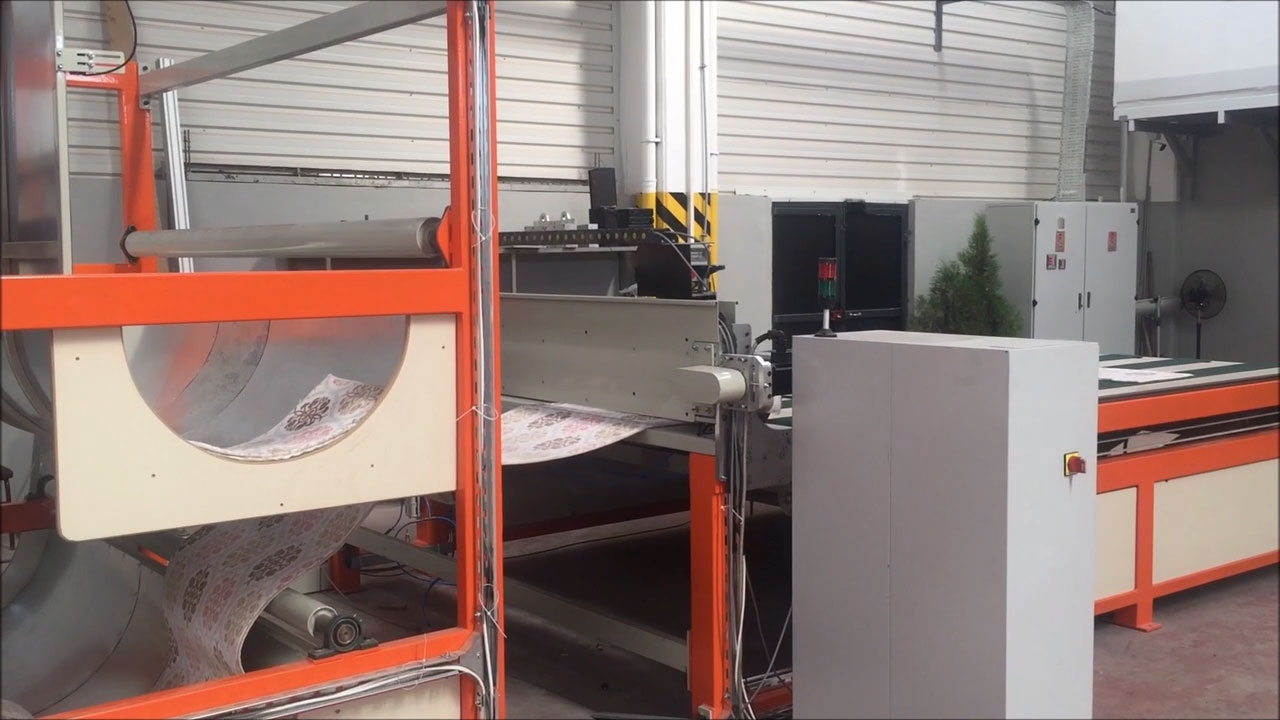 Halı ebatlama makinesi, dokumadan çıkan halıların istenilen ölçüde kesme ünitesinde ki özel sensörler vasıtasıyla pozisyon alıp düz bir şekilde hız kontrollü olarak kesilebilmesine olanak sağlayan bir makinedir.